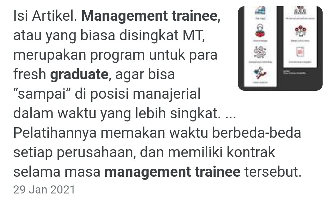 Semua perusahaan membutuhkan pemimpin yang baik namun . Setelah lulus, kamu biasanya akan diberikan posisi yang cukup baik di perusahaan. Aku masih ingat waktu itu aku melihat pengumuman dengan posisi management trainee . Program management trainee memang istimewa, karena menyediakan banyak benefit untuk pesertanya. Pertanyaan seperti, "kenapa anda memilih melamar di posisi pekerjaan ini?" hampir selalu ada di daftar pertanyaan interviewer.